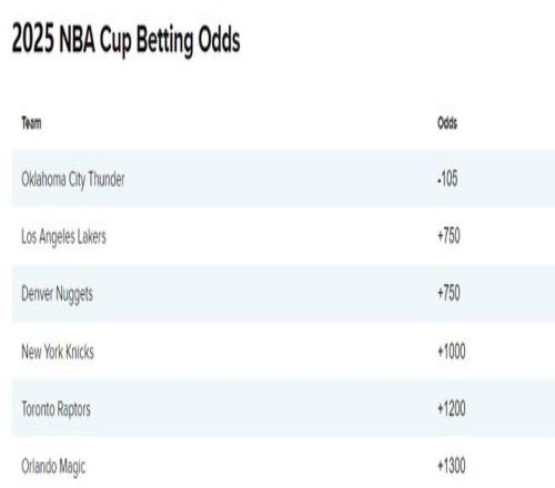 根据最新的杯赛夺冠赔率,雷霆-105断崖第一,湖人+750第二,掘金+750第三,尼克斯+1000第四,猛龙+1200第五,魔术+1300第六,雷霆这个领先的幅度还是无比之大。
