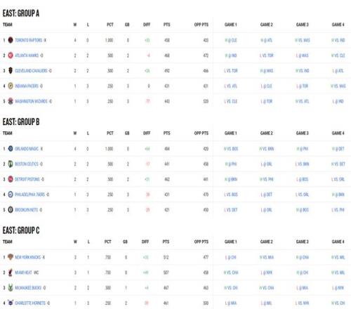东部这边的情况,猛龙、魔术、尼克斯是以小组第一晋级八强,热火是以东部小组战绩第二好(净胜分最多)的身份晋级。魔术+64力压猛龙+55所以是东部头号种子。